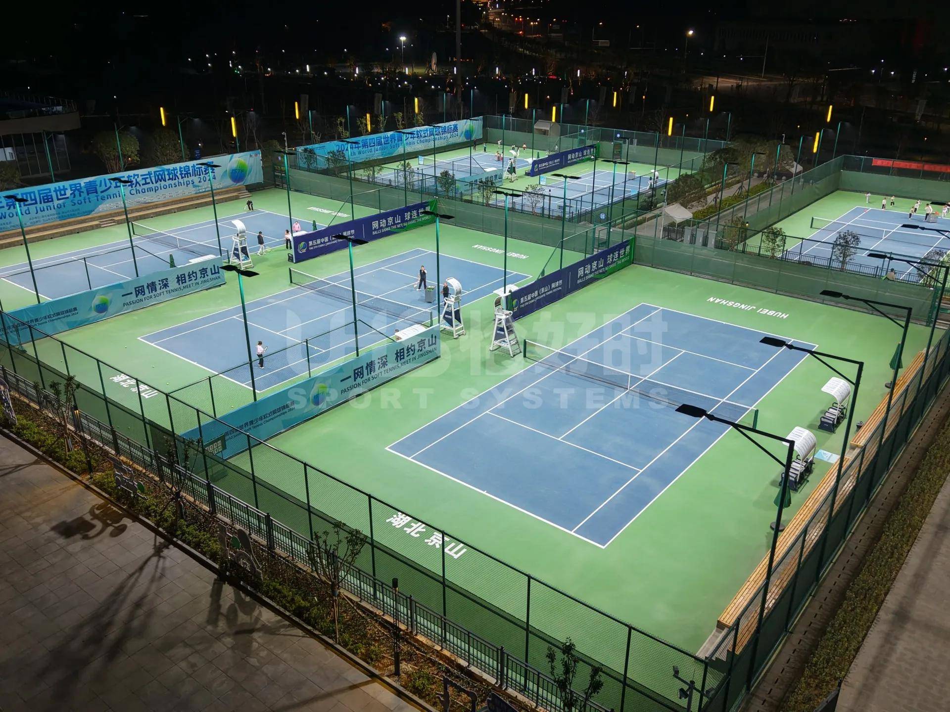 The central court is equipped with the LSS-600W from the Guangfeng Series by MingLiYa Lighting, while all other courts use LTCS professional tennis luminaires.