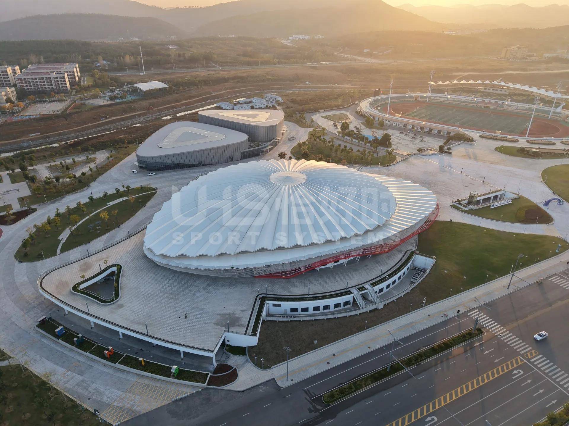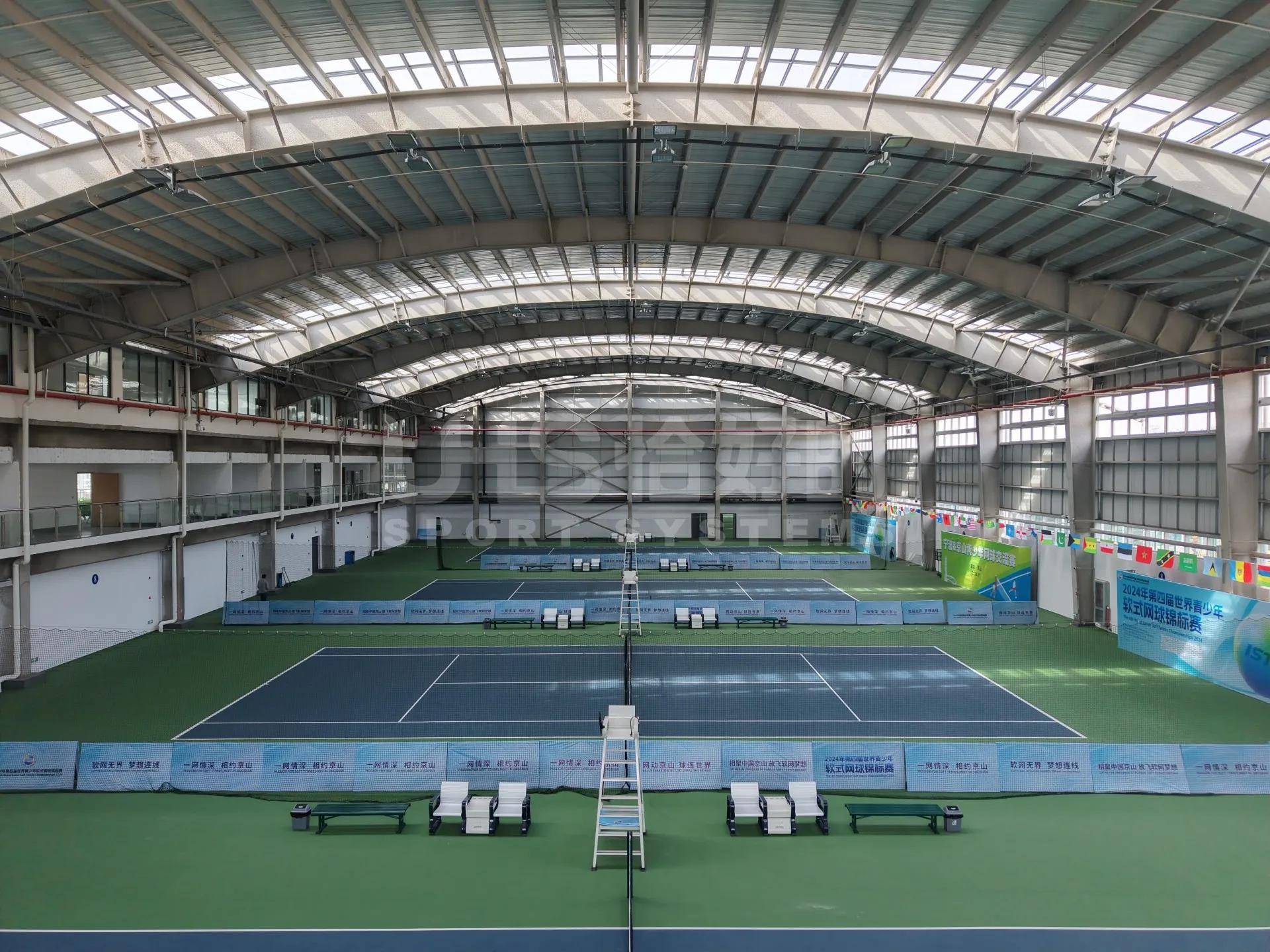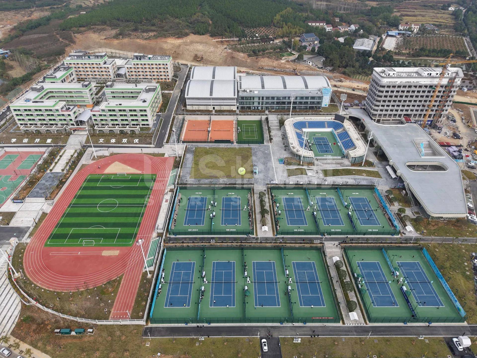 As a one-stop provider of professional sports facility solutions, UHS delivered the full construction of the tennis school—including indoor and outdoor hard courts, a central show court, clay courts, and grass courts—totaling 24 courts across the campus.